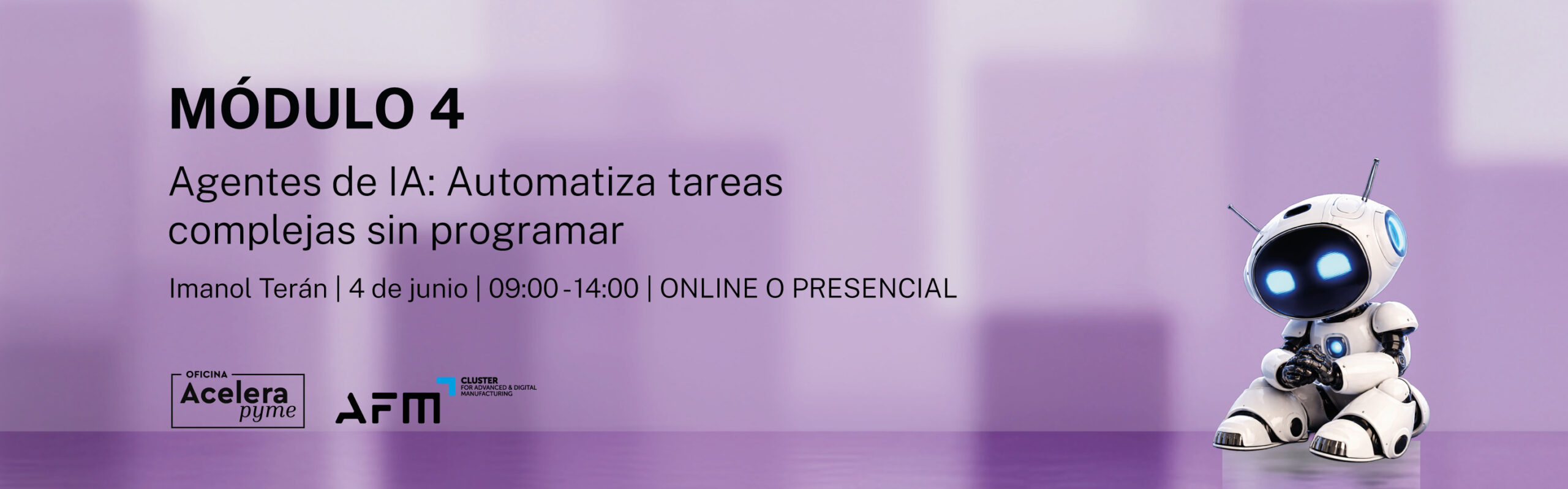 Este módulo introduce qué es un agente de IA y en qué se diferencia de un chatbot. Se aborda la creación de asistentes personalizados para automatizar tareas sin necesidad de programar, aplicados a ámbitos como la atención al cliente, la generación de ofertas, la documentación técnica o el soporte interno.